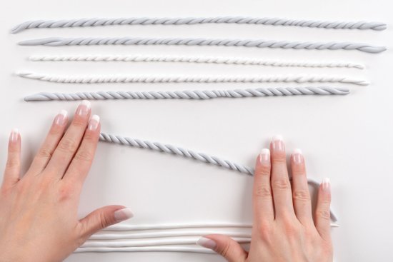3. Ezt követően sodorjunk össze két azonos színű rudat az óramutató járásával ellenkező irányban. Így is három kötelet készítsünk színenként.